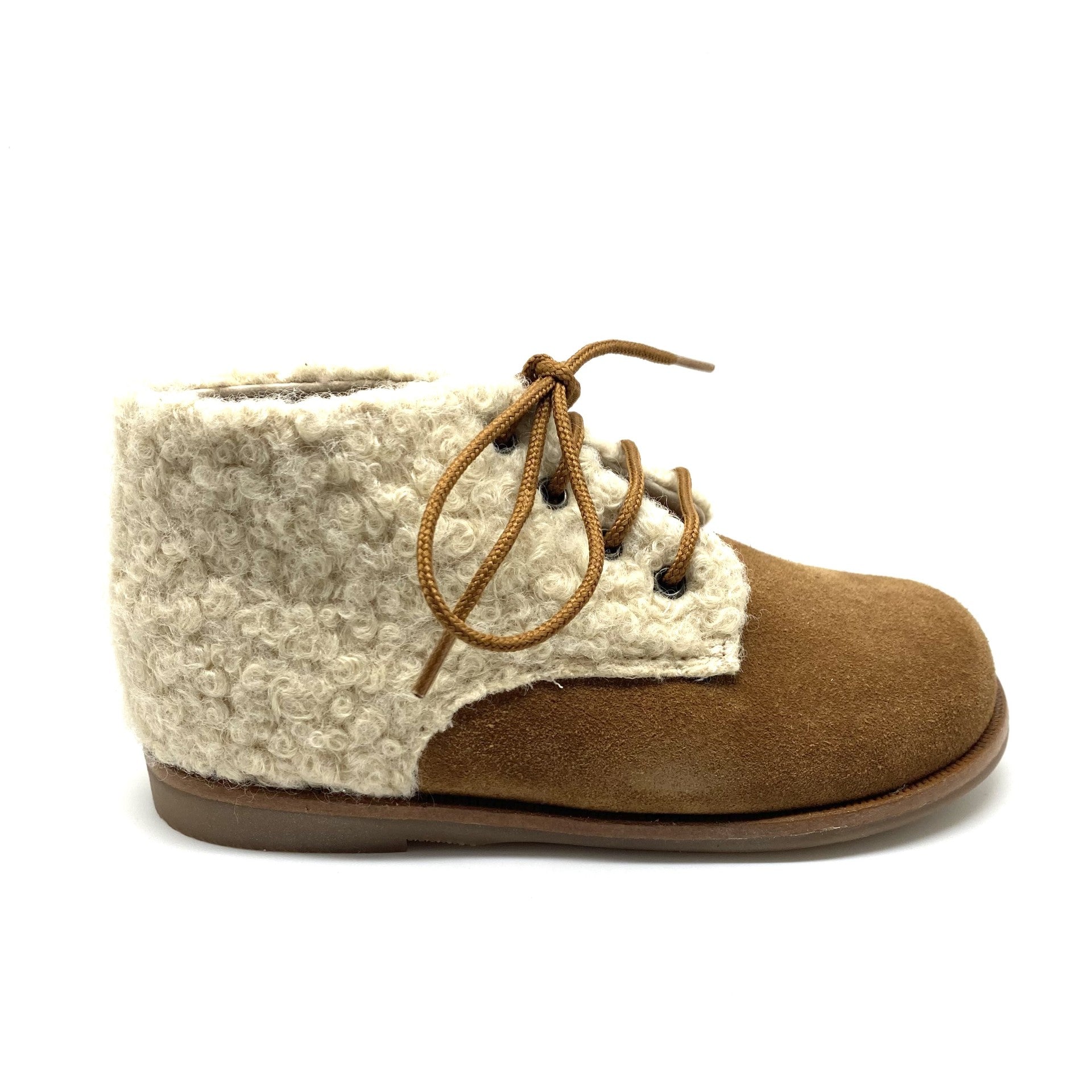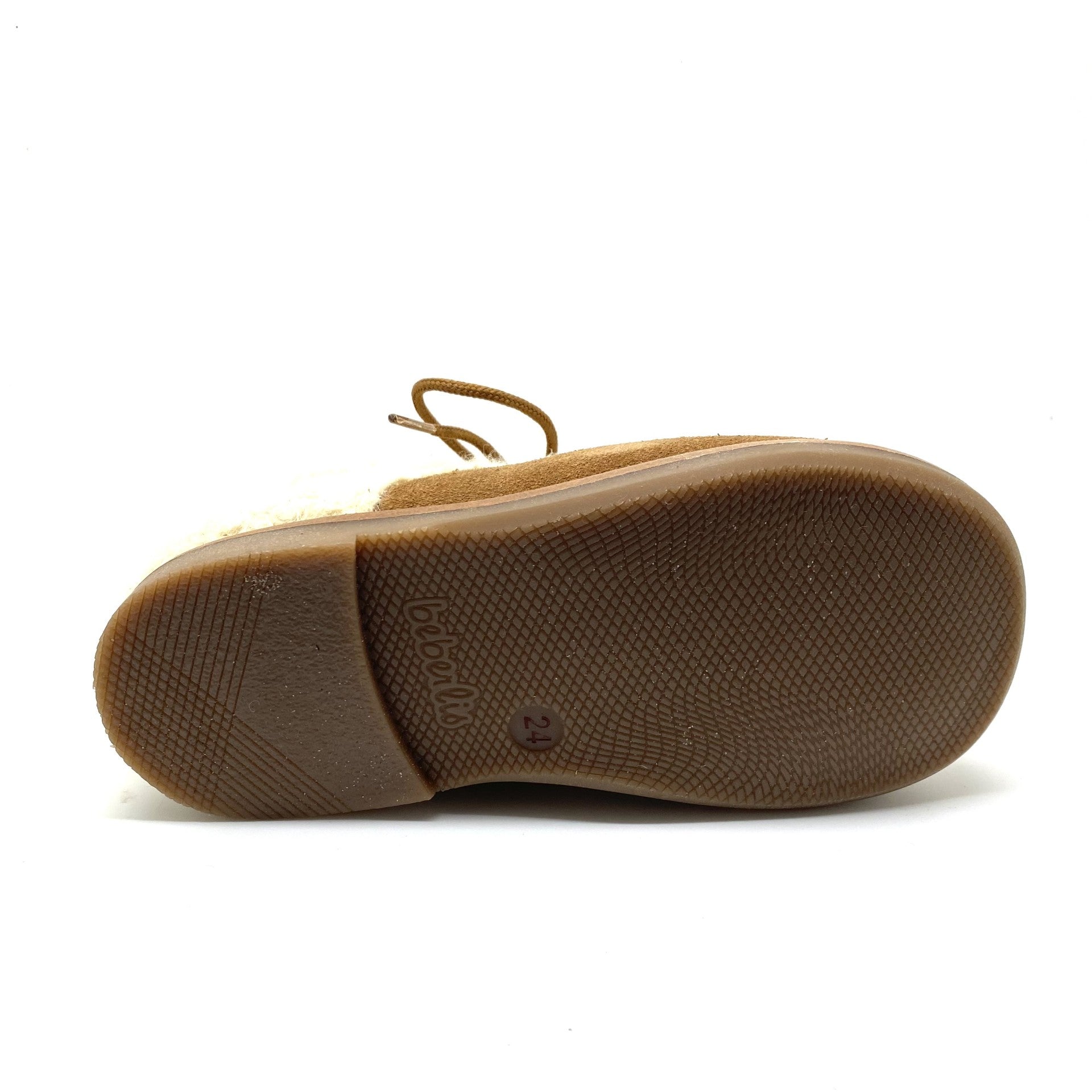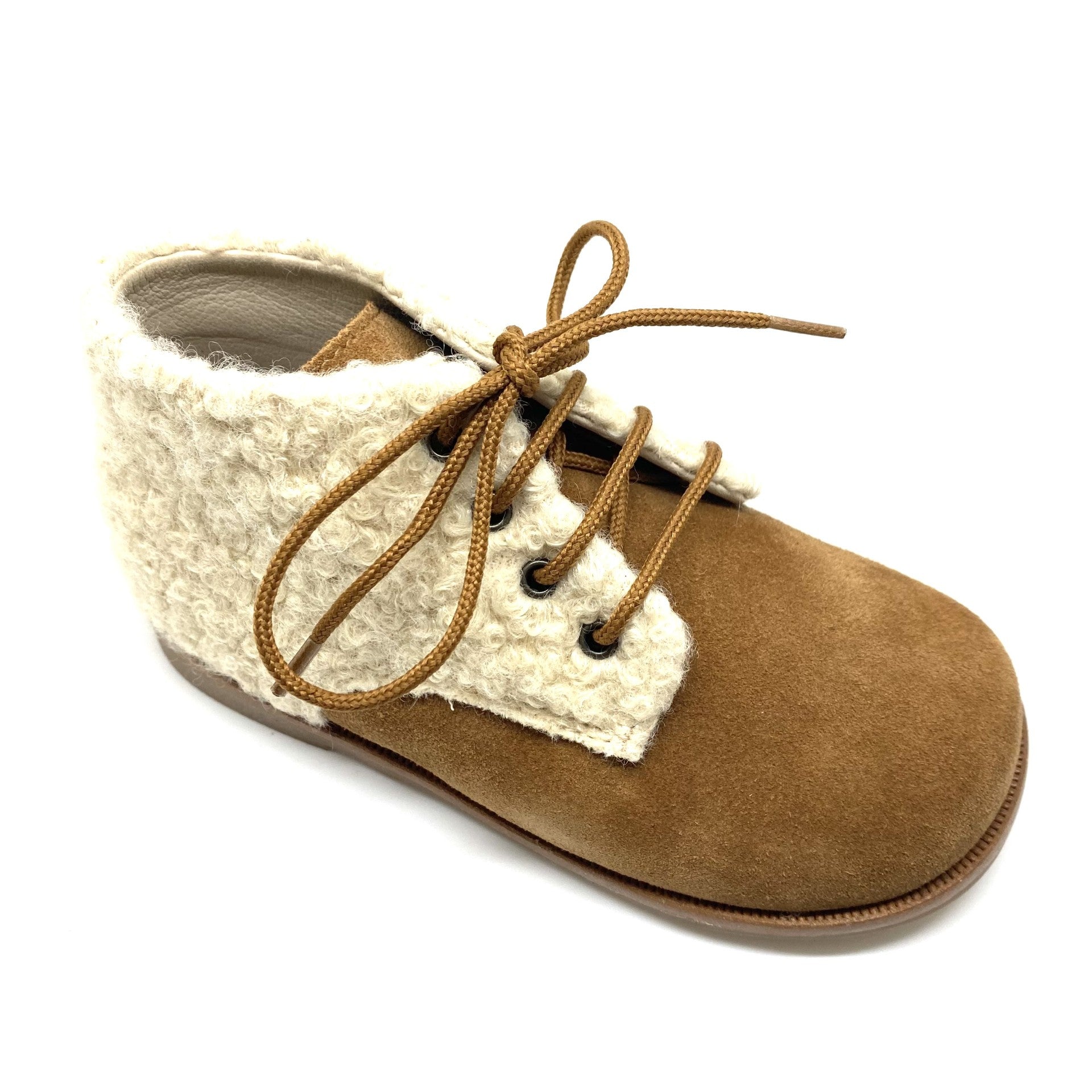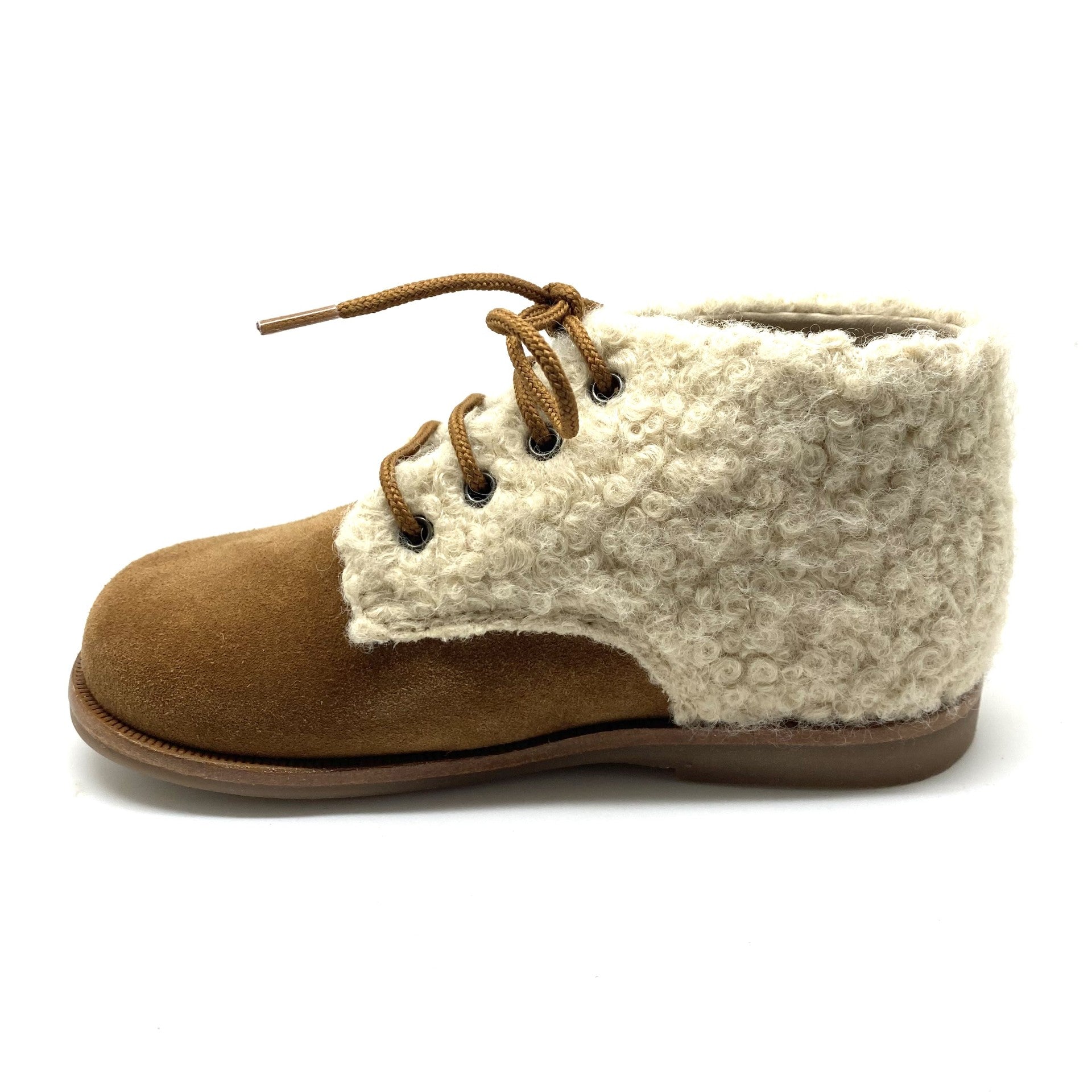 Dit schattig schoentje is uitgevoerd in een warme cognac- kleur nubuck wat zorgt voor een luxe en zachte uitstraling. Aan de buitenzijde is een speels stukje pels toegevoegd, wat het schoentje een unieke en stijlvolle touche geeft. Binnenin is het volledig van leer wat zorgt voor comfort en een ademend vermogen voor kleine voetjes. De uitneembare binnenzool maakt het gemakkelijk om de pasvorm te controleren en bij te houden naarmate het kind groeit. Valt op maat.