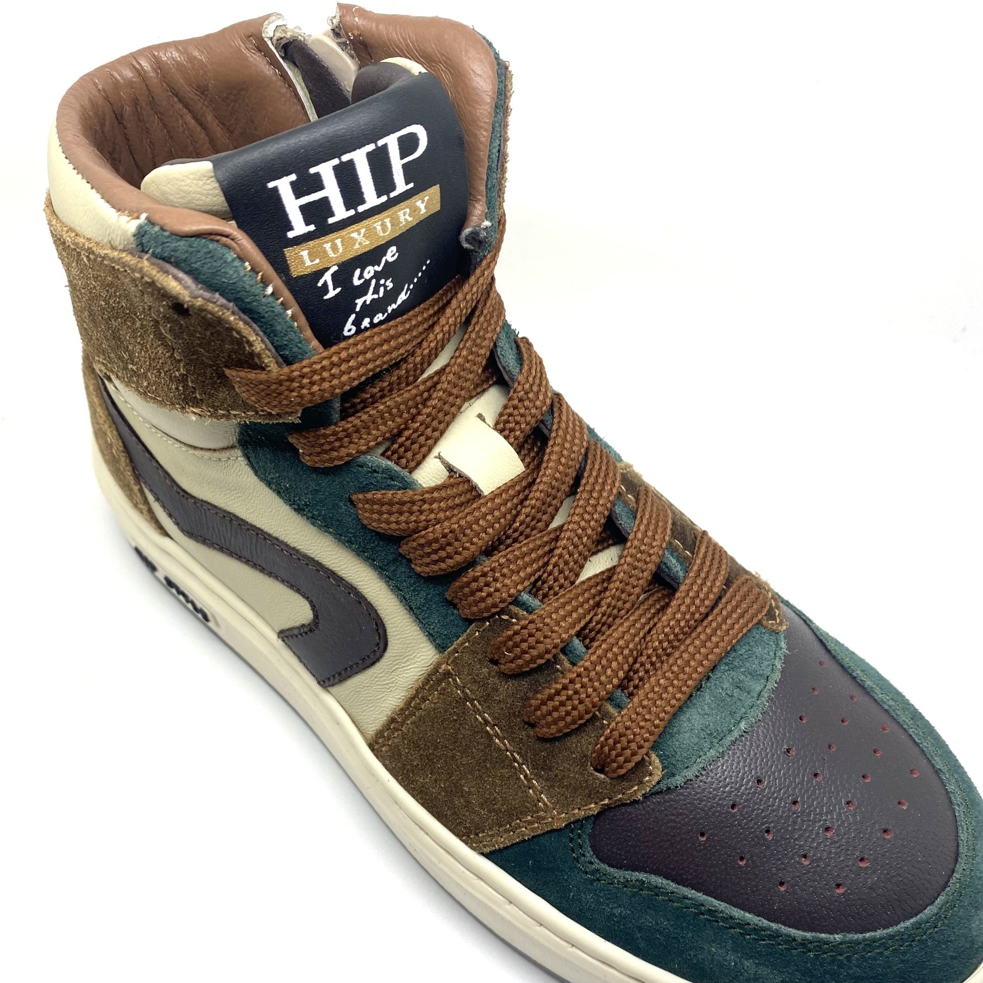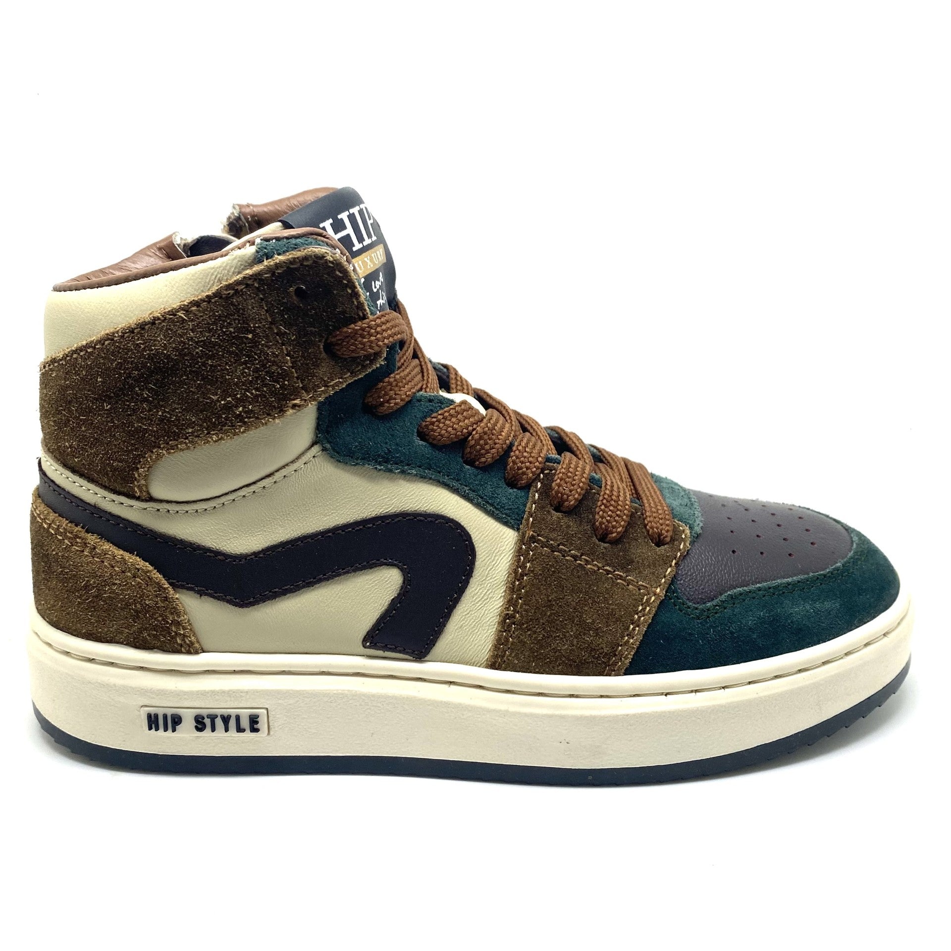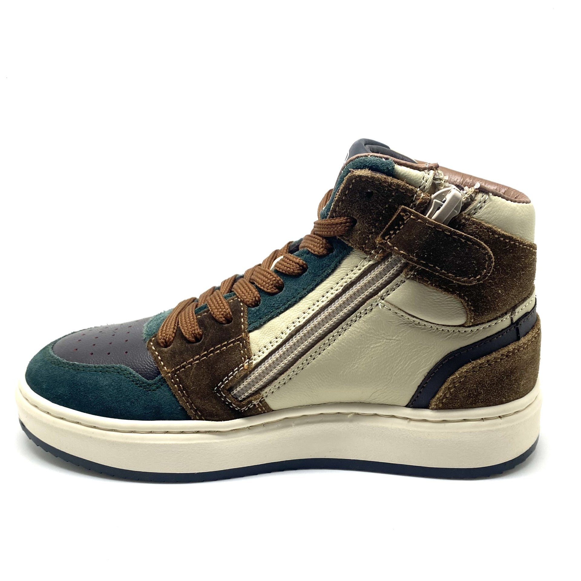 Hoge sneaker volledig in leer gecombineerd met nubuck. Heeft een uitneembaar binnenzooltje. Mooie kleurtjes bruin, groen, beige en grijze accenten. Soepel materiaal. Valt gewoon van maat.