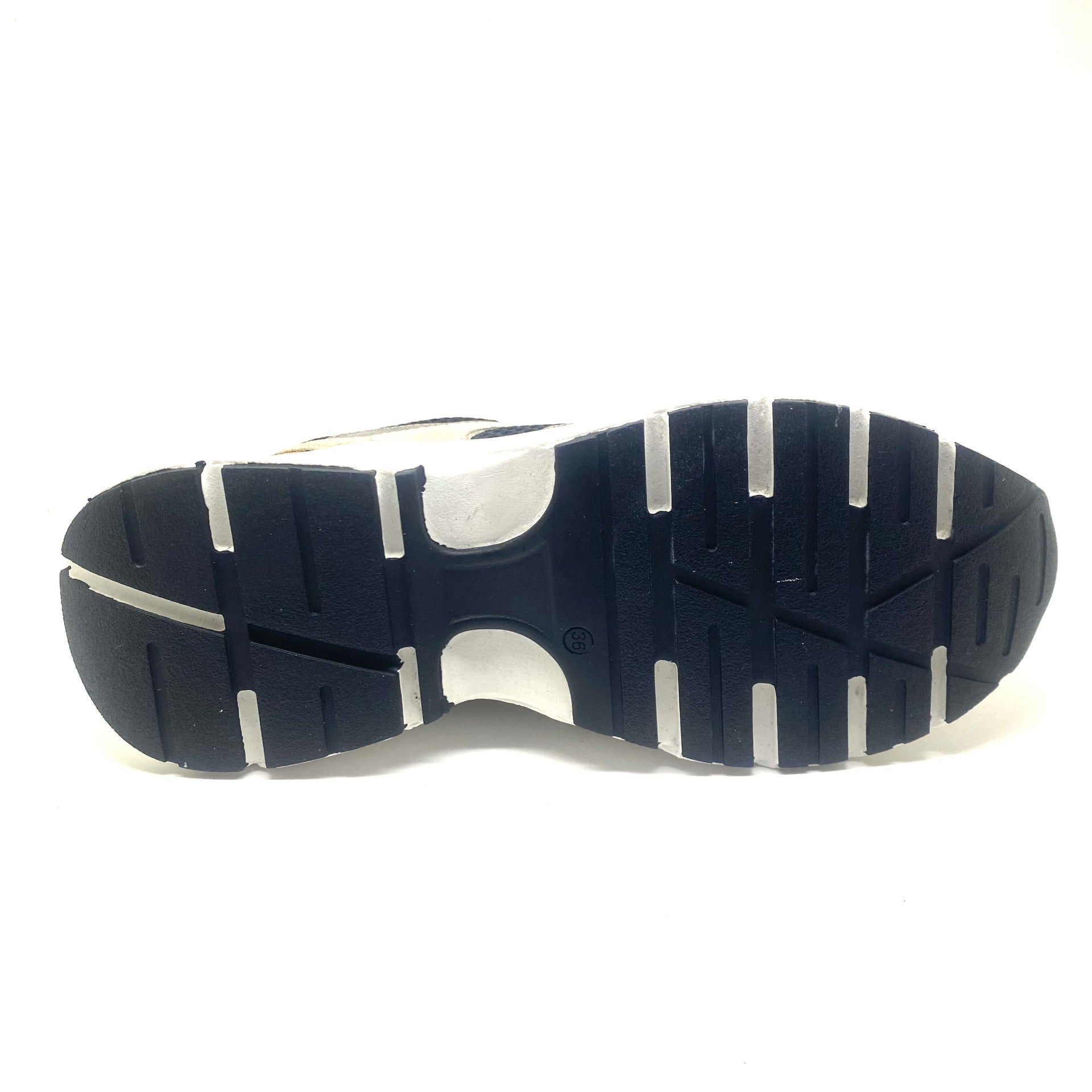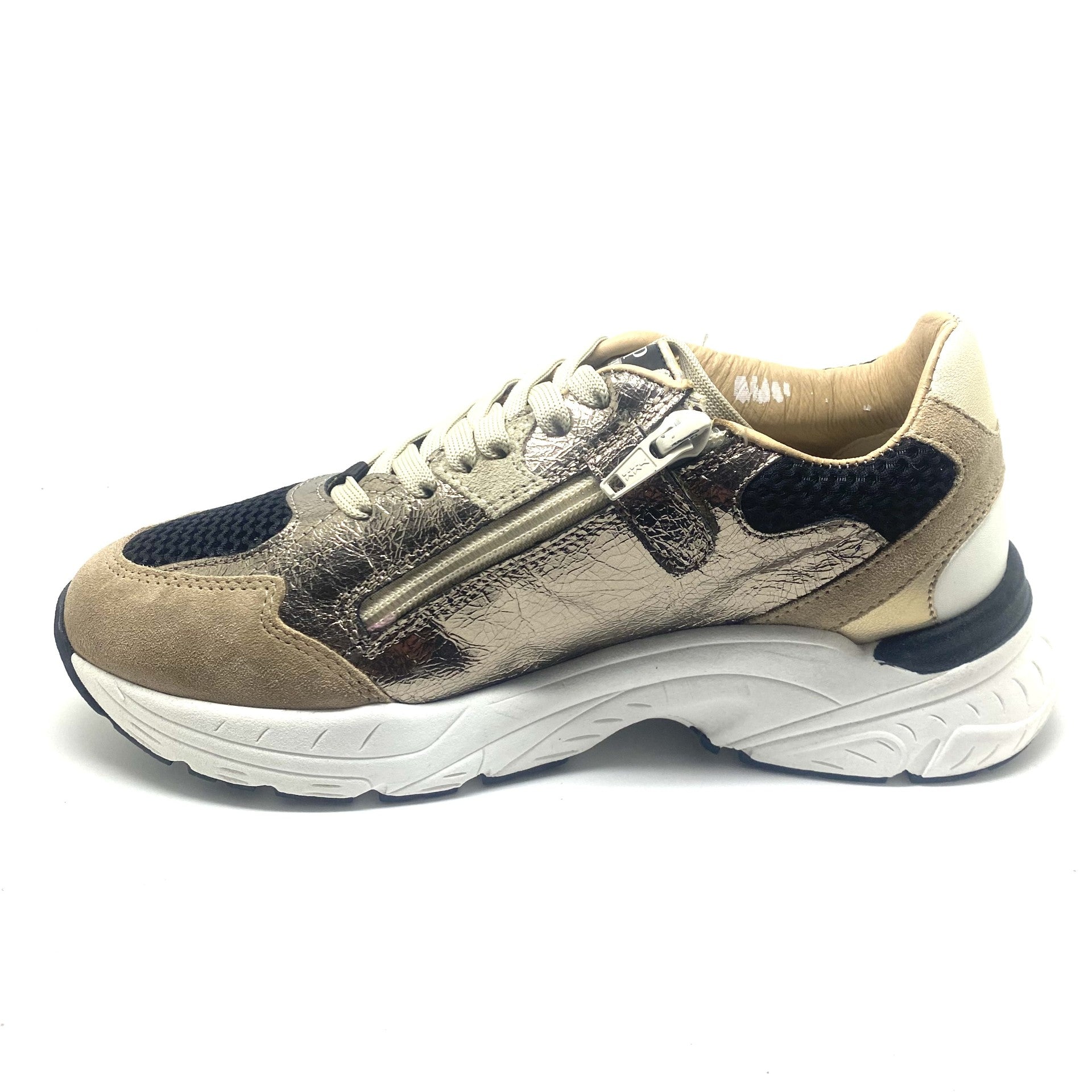 In een stijlvolle mix van beige, bronze en zwart met een stoere stevige zool. Binnenin volledig in leer met een uitneembaar voetbed, ideaal voor steunzolen. Beige veters en een handige rits aan de zijkant.