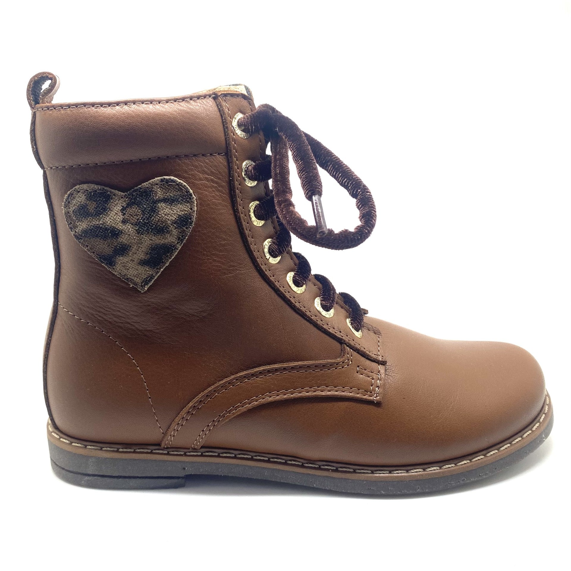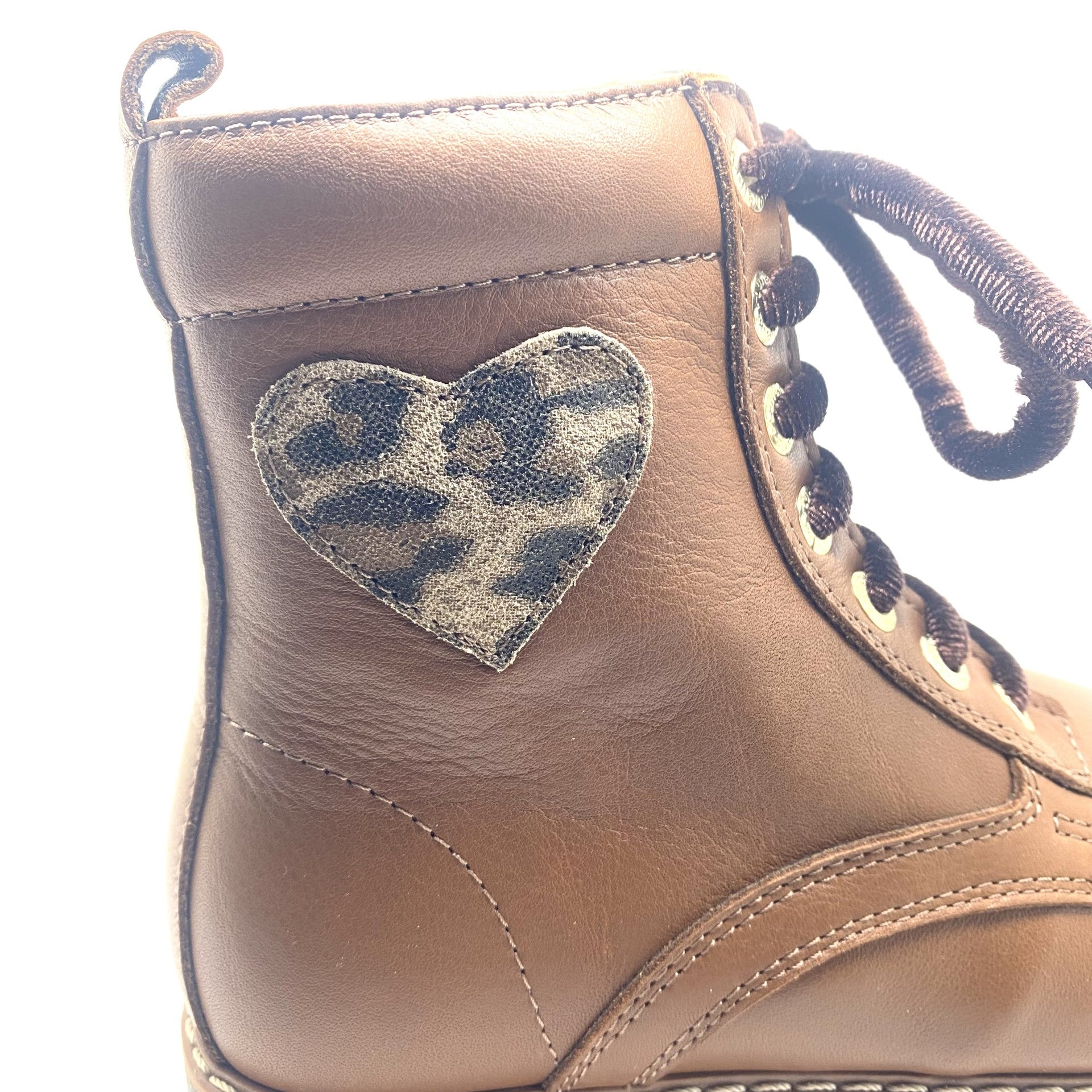 Elegante veter bottine met aan de zijkant een hart in leopard print. Voorzien van een rits aan de zijkant wat het aan en uit trekken super gemakkelijk maakt. In super zacht leer gemaakt. Smalle leest dus ideaal voor smalle voetjes. Valt op maat.