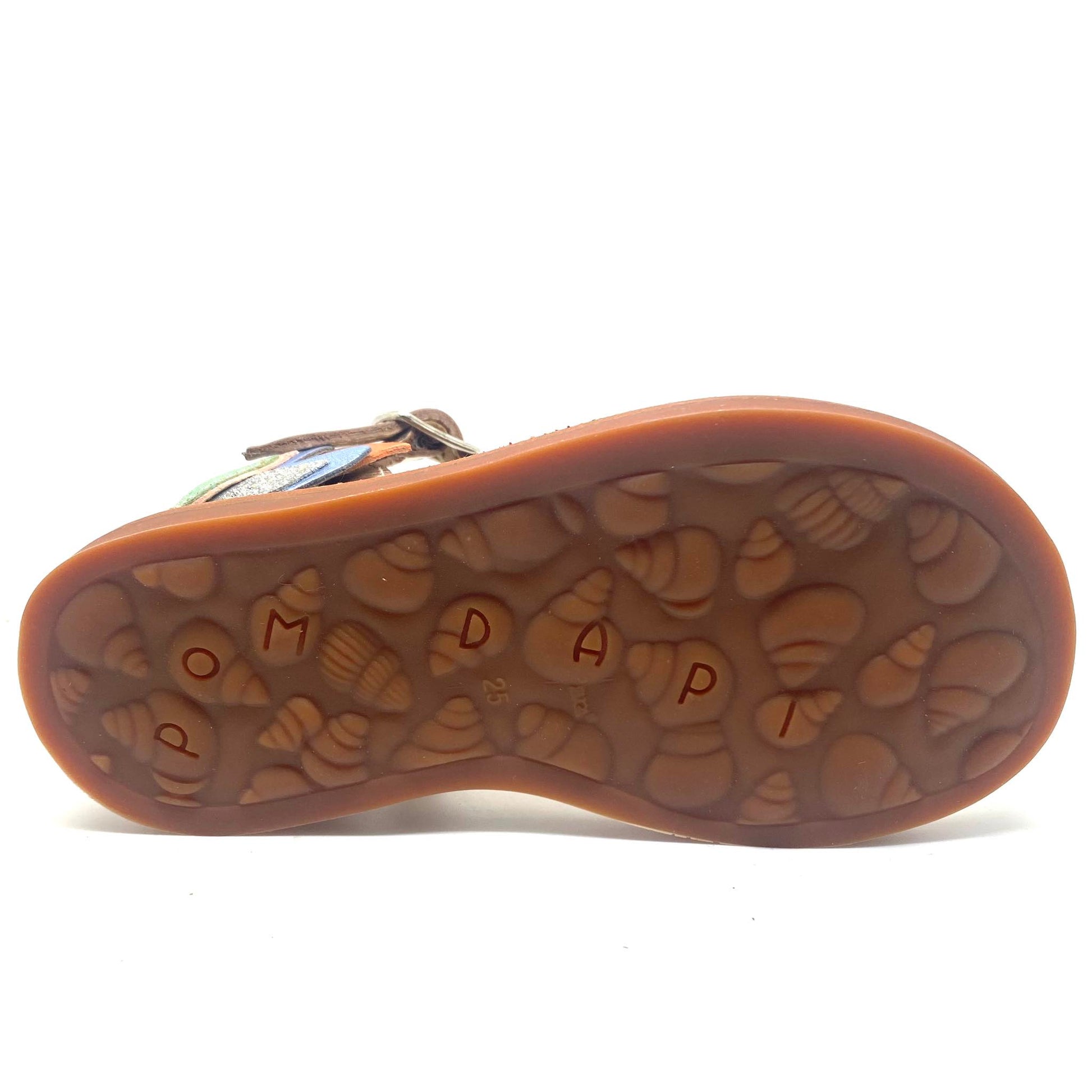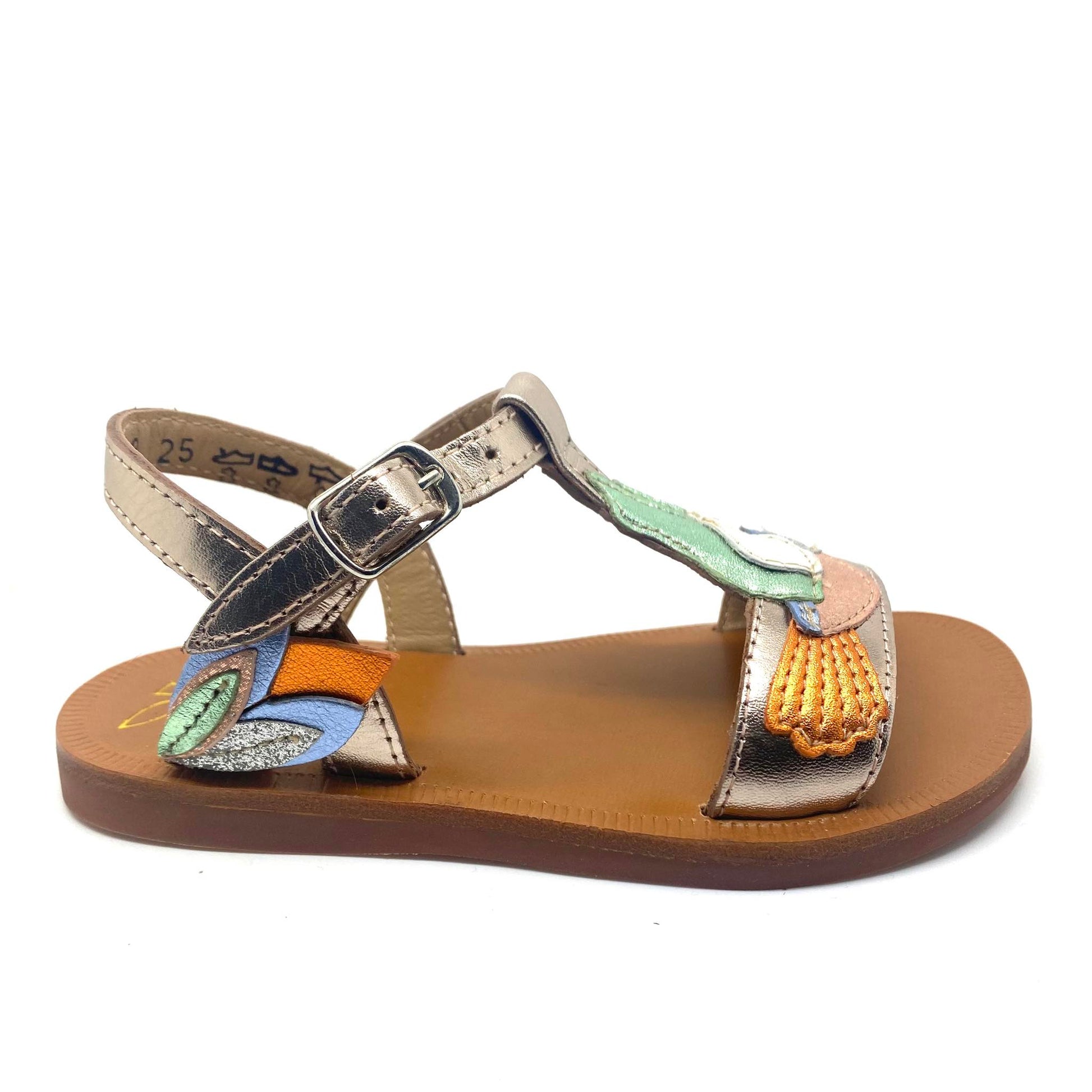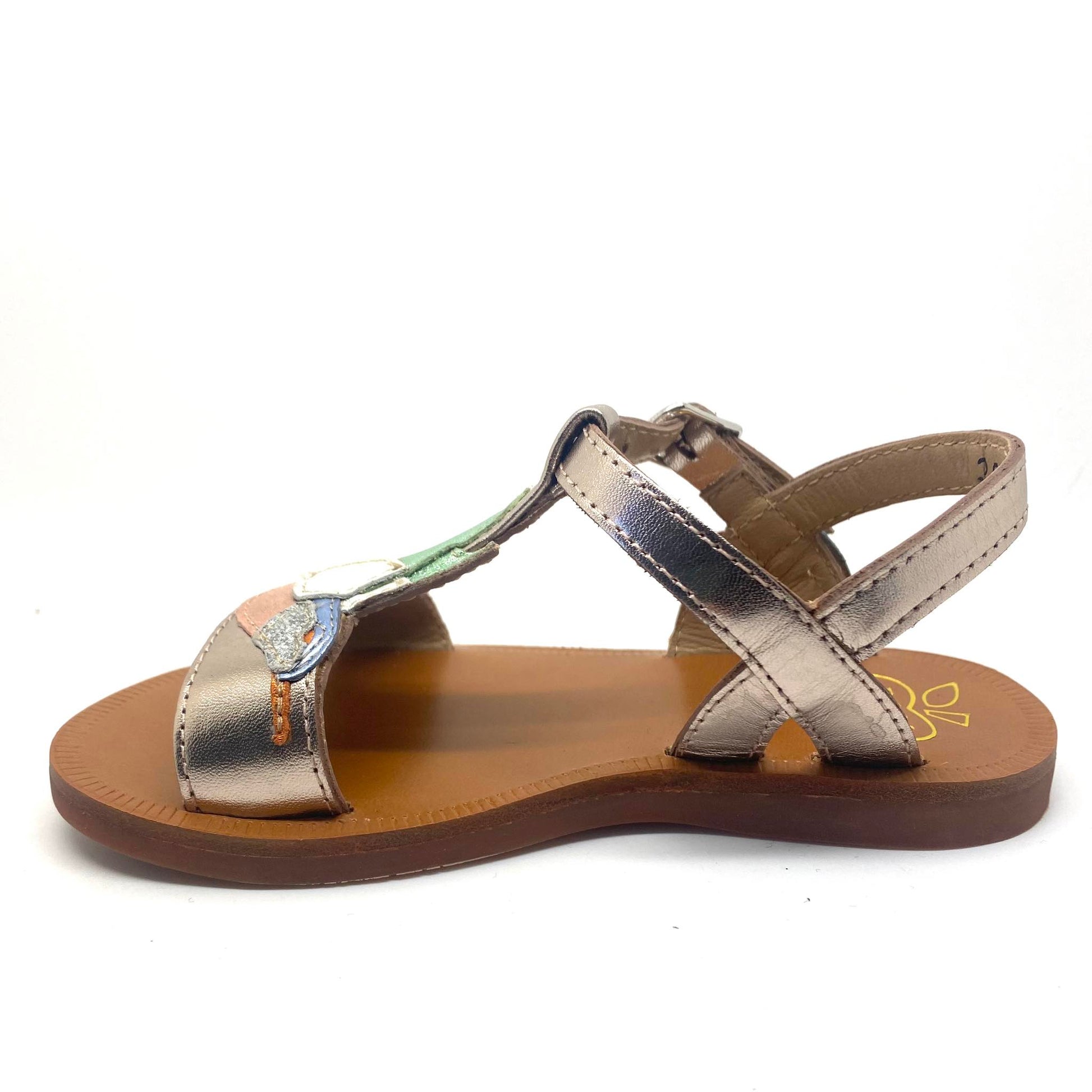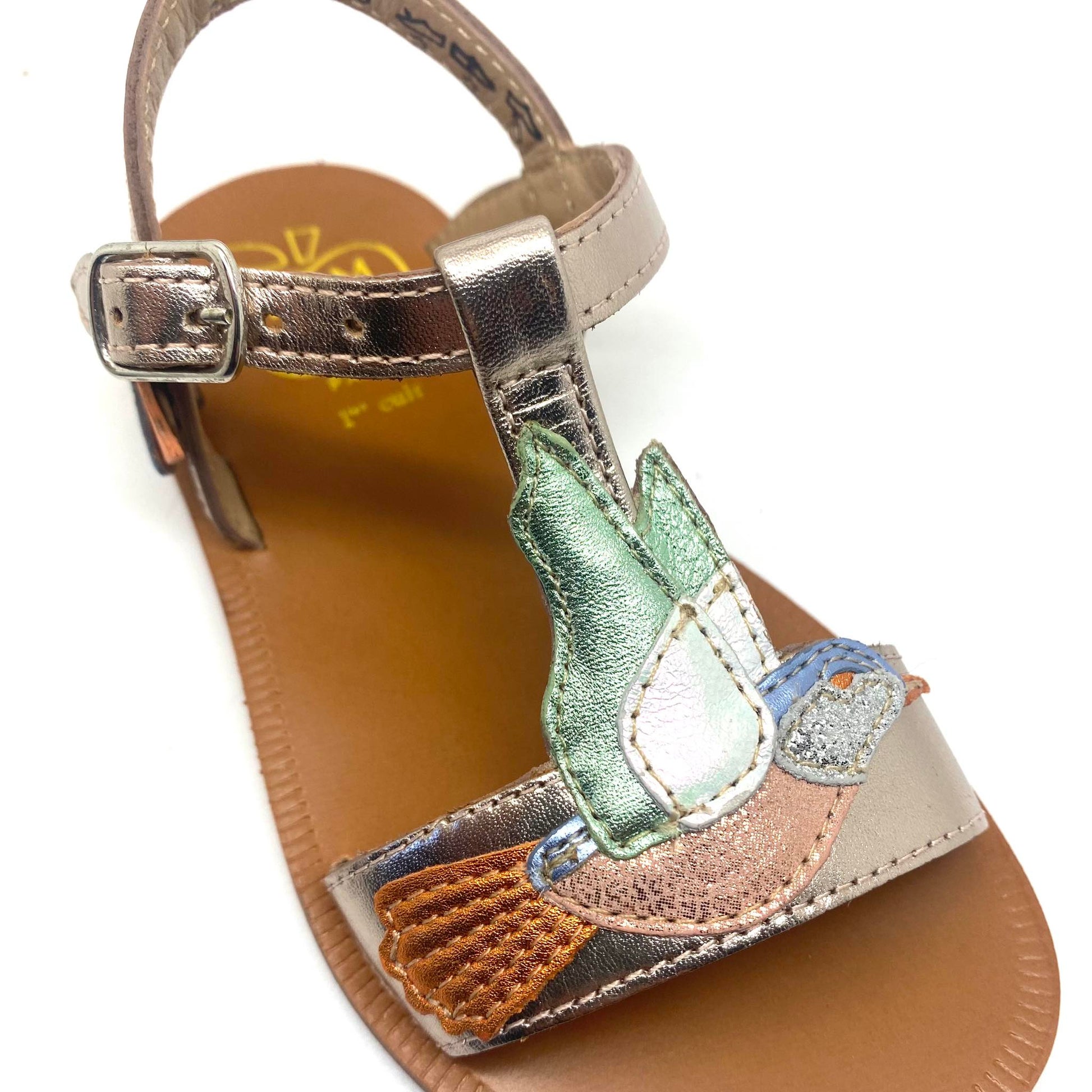Een gouden sandaaltje met een colibri in frisse kleurtjes.